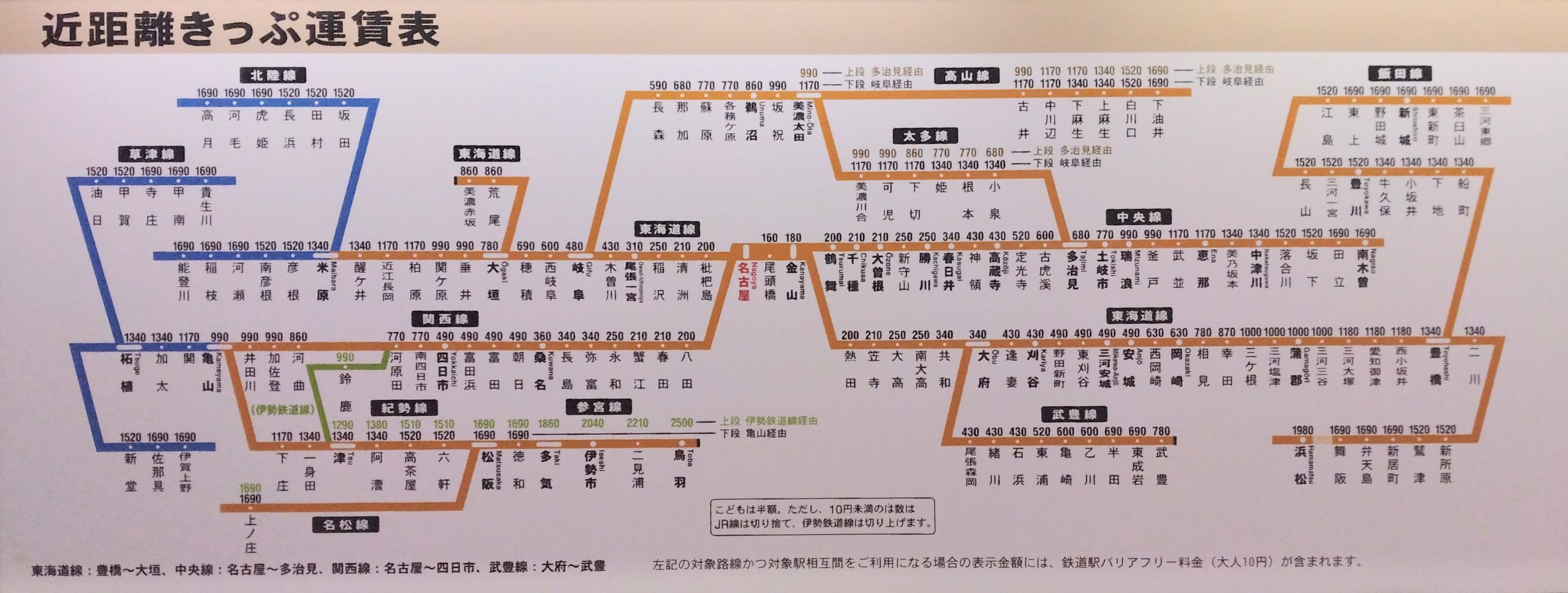 ホーム > 23愛知県 / JR東海 / 乗降者数30万人以上 / 名古屋市 / 名古屋市内 / 新幹線の駅 名古屋駅運賃表 名古屋駅 (なごや) JR東海 東海鉄道事業本部 直営駅名古屋市中村区名駅一丁目1-4事務管コード:▲530116電報略号:ナコ駅構造:高架駅開業:1886(M19)年5月1日 [名古屋市内駅(中心駅)] [駅長配置駅(管理駅)] 乗換駅;地下鉄名古屋駅, 名鉄名古屋駅, 近鉄名古屋駅, あおなみ線名古屋駅 <枇杷島||<八田 東海道本線中央本線関西本線 尾頭橋>金山>|| Views: 87 カテゴリー:23愛知県JR東海乗降者数30万人以上名古屋市名古屋市内新幹線の駅 タグ:中央本線東海道本線関西本線 KN 旅が好き シェアする Twitter でシェア はてなブックマークに保存 LINE でシェア Facebook でシェア Pocket に保存 Feedly で購読 関連投稿 14神奈川県 / 横浜支社 辻堂駅運賃表 13東京都 / JR東日本 / 千代田区 / 山手線内 / 東京都区内 / 首都圏本部 水道橋駅運賃表 23愛知県 / JR東海 / 東海鉄道事業本部 刈谷駅運賃表 25滋賀県 / JR西日本 / 京滋支社 米原駅運賃表 14神奈川県 / JR市内駅 / JR東日本 / 川崎市 / 横浜市内 / 横浜支社 川崎駅運賃表 13東京都 / 山手線内 / 東京都区内 / 港区 新橋駅運賃表 前の投稿 東京駅運賃表 次の投稿 近鉄京都駅運賃表
