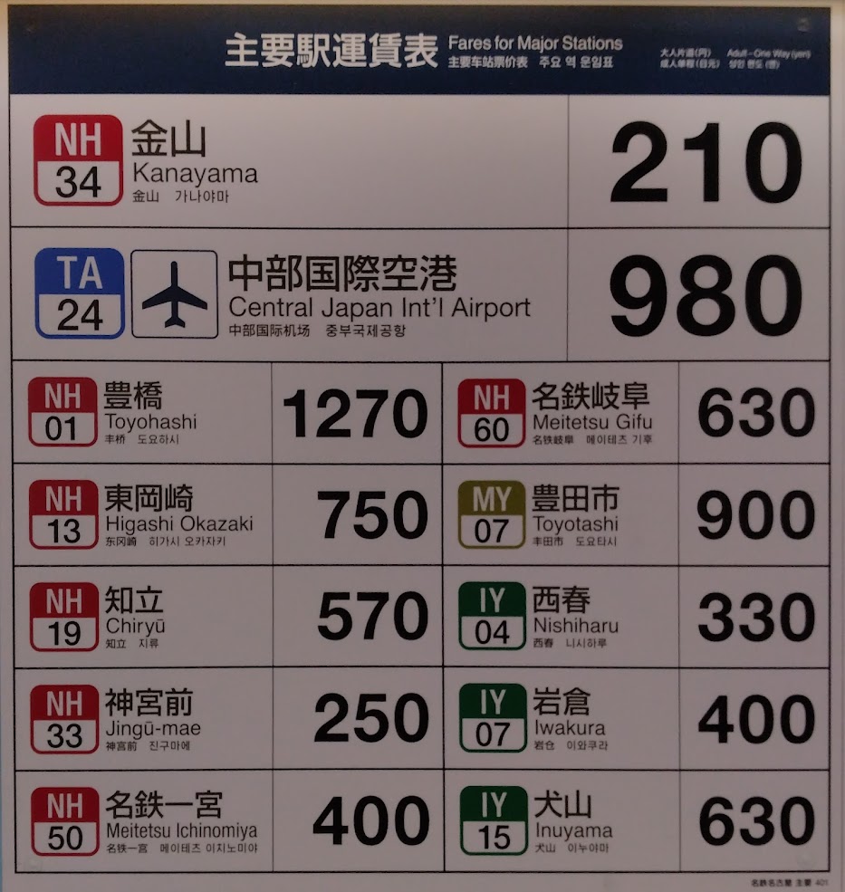 ホーム > 名鉄 / 東海私鉄 名鉄名古屋駅運賃表 名鉄名古屋駅 (めいてつなごや) 名古屋鉄道名古屋市中村区名駅一丁目2番1号駅番号:NH36駅構造:地下駅ホーム:3面2線開業:1941(S16)年8月12日乗換駅:地下鉄名古屋駅, JR名古屋駅, 近鉄名古屋駅, あおなみ線名古屋駅 <栄生 名鉄名古屋 山王> Views: 37 カテゴリー:名鉄東海私鉄 タグ:名古屋本線 KN 旅が好き シェアする Twitter でシェア はてなブックマークに保存 LINE でシェア Facebook でシェア Pocket に保存 Feedly で購読 関連投稿 23愛知県 / 名古屋市 / 名鉄 名鉄 金山駅運賃表 23愛知県 / 名鉄 名鉄 黒田駅運賃表 23愛知県 / 名鉄 / 東海私鉄 / 終着駅 名鉄豊橋駅運賃表 23愛知県 / 名鉄 / 東海私鉄 名鉄一宮駅運賃表 21岐阜県 / 名鉄 / 東海私鉄 名鉄岐阜駅運賃表 23愛知県 / 名古屋市 / 東海私鉄 あおなみ線 名古屋駅運賃表 前の投稿 近鉄名古屋駅運賃表 次の投稿 岐阜駅運賃表