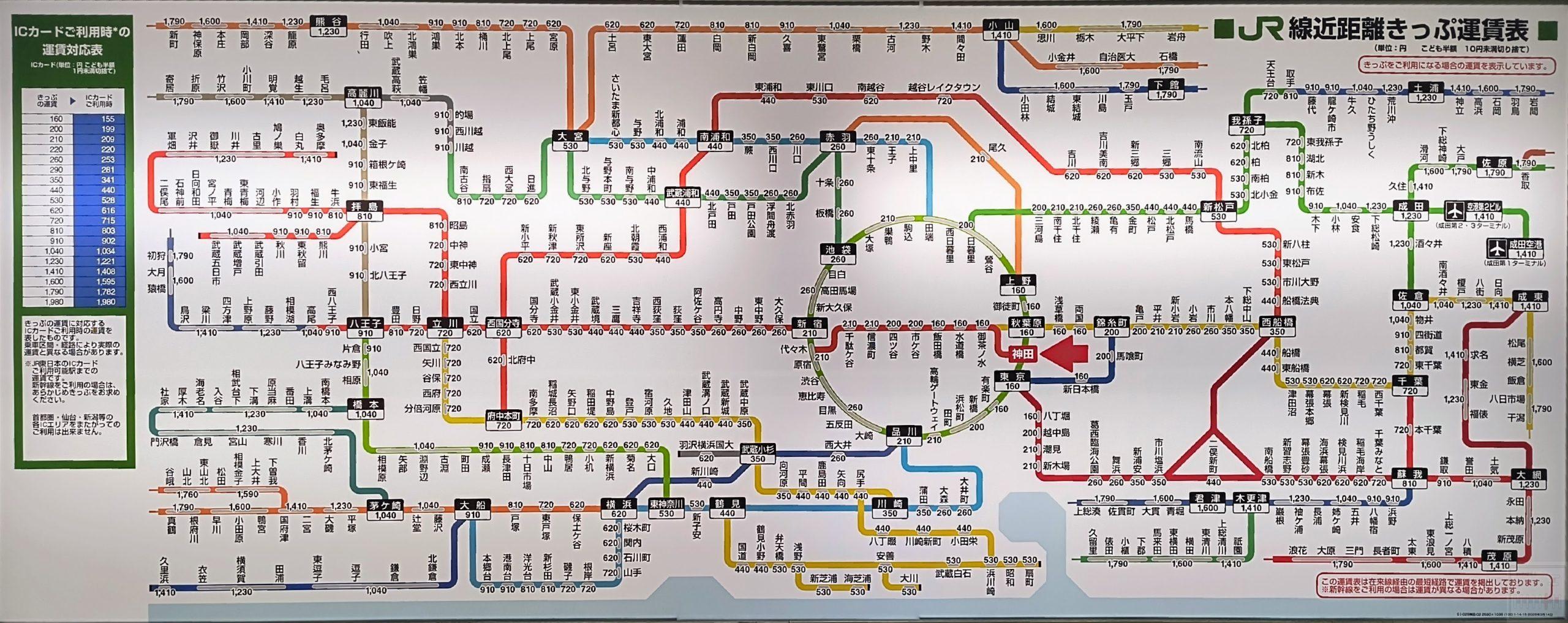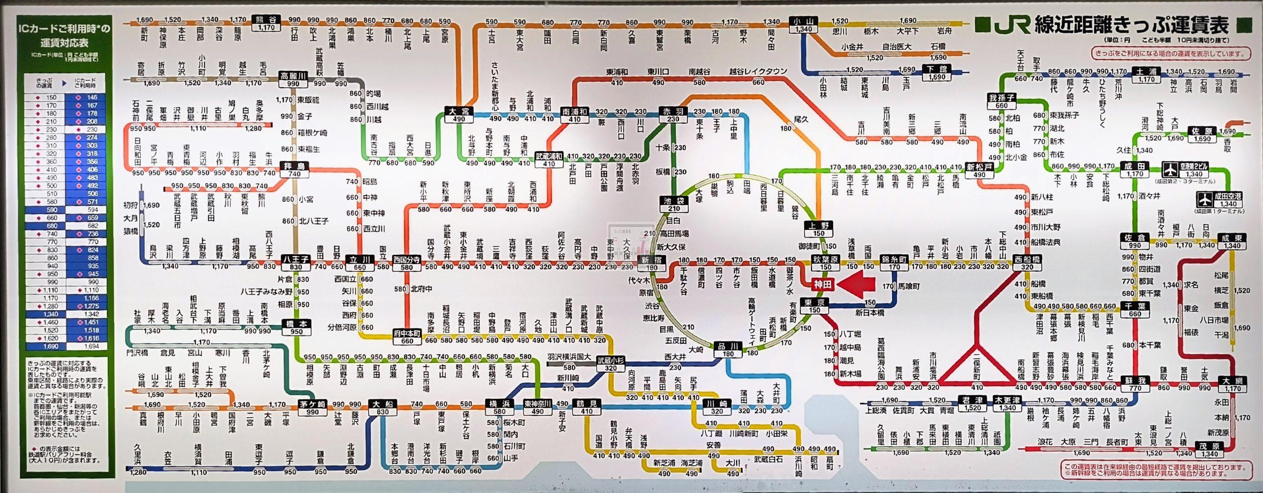 ホーム > 13東京都 / JR東日本 / 千代田区 / 山手線内 / 東京都区内 / 首都圏本部 神田駅運賃表 2026/3/14~ 2023/3/18~2026/3/13 神田駅 (かんだ) JR東日本 首都圏本部 直営駅東京都千代田区鍛冶町二丁目13-1事務管コード:▲440501駅番号:KND, JC02, JK27, JY02駅構造:高架駅ホーム:3面6線開業;1919(T8)年3月1日乗換駅:東京メトロ神田駅 <東京<東京 (山手線)(中央本線) 秋葉原>お茶の水> Views: 46 カテゴリー:13東京都JR東日本千代田区山手線内東京都区内首都圏本部 タグ:中央本線京浜東北線山手線 KN 旅が好き シェアする Twitter でシェア はてなブックマークに保存 LINE でシェア Facebook でシェア Pocket に保存 Feedly で購読 関連投稿 13東京都 / JR東日本 / 台東区 / 首都圏本部 御徒町駅運賃表 13東京都 / JR東日本 / 品川区 / 山手線内 / 東京都区内 / 首都圏本部 目黒駅運賃表 13東京都 / JR東日本 / 中野区 / 東京都区内 / 首都圏本部 東中野駅運賃表 14神奈川県 / JR市内駅 / JR東日本 / 川崎市 / 横浜市内 / 横浜支社 川崎駅運賃表 11埼玉県 / JR東日本 / 大宮支社 蕨駅運賃表 13東京都 / 3関東 / JR / JR東日本 / 東京都区内 / 首都圏本部 大井町駅 運賃表 前の投稿 メトロ西日暮里駅運賃表 次の投稿 岩本町駅運賃表