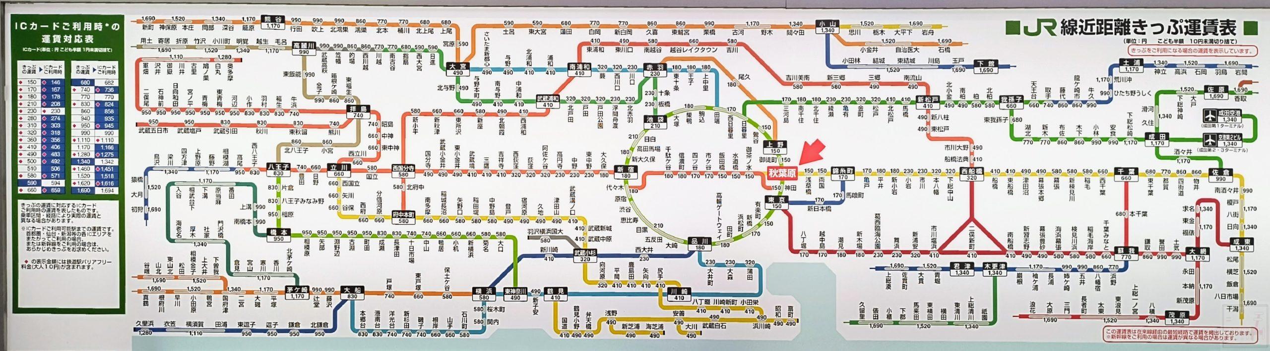 ホーム > 13東京都 / JR東日本 / 千代田区 / 山手線内 / 東京都区内 / 首都圏本部 秋葉原駅運賃表 2026/3/14~ 2026/3/15 18:43 2023/3/18~2026/3/13 2025/12/14 17:14 秋葉原駅 (あきはばら) JR東日本 首都圏本部 業務委託駅事務管コード:▲441001乗換駅:つくばエクスプレス秋葉原駅, 東京メトロ秋葉原駅, 都営地下鉄岩本町駅 <神田<御茶ノ水 秋葉原 御徒町>浅草橋> Views: 68 カテゴリー:13東京都JR東日本千代田区山手線内東京都区内首都圏本部 タグ:京浜東北線山手線東北本線総武本線 KN 旅が好き シェアする Twitter でシェア はてなブックマークに保存 LINE でシェア Facebook でシェア Pocket に保存 Feedly で購読 関連投稿 13東京都 / 品川区 / 山手線内 / 東京都区内 五反田駅運賃表 13東京都 / 3関東 / JR / JR東日本 / 乗降者数30万人以上 / 山手線内 / 東京都区内 / 終着駅 / 関東の駅100選 / 首都圏本部 上野駅運賃表 03岩手県 / 盛岡支社 一ノ関駅運賃表 11埼玉県 / JR東日本 / さいたま市 / 大宮支社 浦和駅運賃表 13東京都 / JR東日本 / 中央区 / 乗降者数30万人以上 / 山手線内 / 東京都区内 / 終着駅 / 関東の駅100選 / 首都圏本部 東京駅運賃表 11埼玉県 / JR東日本 / さいたま市 / 大宮支社 さいたま新都心駅運賃表 前の投稿 浅草橋駅運賃表 次の投稿 亀戸駅運賃表